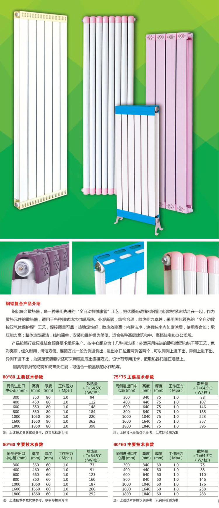 在銅鋁復(fù)合散熱器結(jié)構(gòu)相同的基礎(chǔ)上用鋼管代替銅管,降低了成本。承壓能力強(qiáng),散熱效果好,使用壽命長(zhǎng)(可與供暖系統(tǒng)管材壽命相同)。外表采用環(huán)保粉末靜電噴塑處理,無放射性元素、無異味、環(huán)保、安全、色彩絢麗、造型典雅,裝飾性強(qiáng)。外表及內(nèi)腔潔凈,使用分戶計(jì)量的采暖方式。