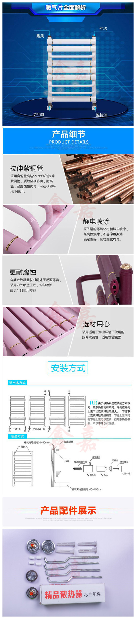 衛(wèi)浴系列散熱器按行業(yè)標準結合顧客要求組織生產(chǎn)。產(chǎn)品分為銅管、鋼管、銅鋁復合三種,管徑分為ф25、50×25橢圓管兩種,進出水口、中心距、顏色和長度有多種供客戶選擇。散熱器外表采用先進的靜電噴塑和烘干等工藝,色彩亮麗,經(jīng)久耐用,清潔方便。